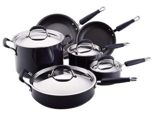 Features: Includes 1-quart and 2-quart covered saucepans, 8-quart covered stockpot, 11-inch, 4-1/4-quart covered sauté pan, and 8- and 10-inch French skillets Hard-base, navy blue porcelain exteriors surround aluminum core for efficient heat distribution Stay-cool CoolGrip handles feature stainless shafts with silicone rubber grips Hand washing recommended; oven-safe to 400 degrees F Limited lifetime warranty